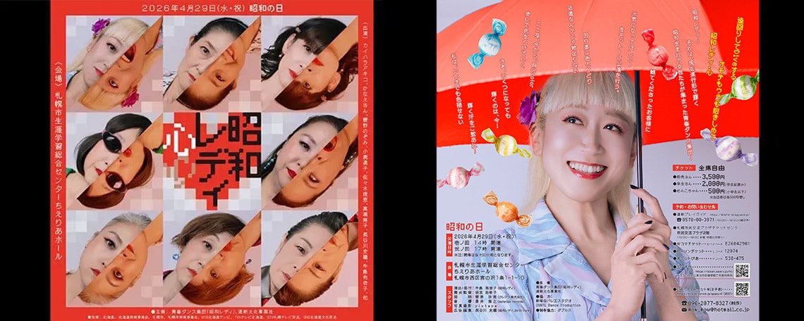 | 昭和レディ… それは、現在進行形で輝く昭和生まれの女性たちが集まった青春ダンス集団! 観てくださったお客様に元気になってほしい!をモットーに公演を行う。 最近はAIなどが現れ、効率的に最短の道で…という考えが増えてきていると思います。それももちろん大切なのですが、遠回りしてこそ得られる宝物のようなものがあります。昔は今のように情報がたくさんなかったので、みんなが時間をかけて物事を成し遂げてきました。その経験の大切さ、そしてそこには人間らしさというものがあるかと思います。便利になってきた反面、AIと人間の違い、人間にしかできないものは何なのかがこれからもっと大切になってきます。それを作品を通してご覧いただけたらと思っております。 …と真面目な感じは置いといて、たくさんの方に笑っていただき、前を向いていただけたらと思い創作しております! 是非ご期待ください。 各種プレイガイドチケット販売は1/5月10:00〜です! メンバーにでしたら今からでもご予約お受けできます笑 また今年の昭和の日に皆様にお会いできることを楽しみにしております!! 遠回りしてDiveする オモテもウラも抱きしめて 昭和レディ・心 昭和レディ… それは、現在進行形で輝く昭和生まれの女性たちが集まった青春ダンス集団! 観てくださったお客様に元気になってほしい!をモットーに公演を行う。 回り道は色とりどり 近道なんかじゃ物足りない ここ空、今から、自分color 歩いて色をつけていく さぁ、いくつになっても輝くのは、今!! 輝く汗をご覧あれ! 私は、いつまでも色褪せない ●公演日時 昭和の日(2026年4月29日(水・祝) ) ・壱ノ回 14時 開演 ・弐ノ回 17時 開演 注:開場は各々30分前となります。 ●会場 札幌市生涯学習総合センターちえりあホール 札幌市西区宮の沢一条1-1-10 ●出演 カイハラアキコ、かなえさん、菅野のぞみ、小鹿道子、佐々木理恵、高瀬育子、長谷川史織、牛島有佳子 他 ●スタッフ 演出・振付 : 牛島有佳子(昭和レディ) 舞台監督 : 坂本 由希子 照明 : 菅原 渉吾(クレアス株式会社) 音響 : 景井 雅之(matatabi records) 写真撮影:yixtape 広告編集:長谷川 史織(昭和レディ、Birth Farm) ●料金 全席自由 ・前売さん 3,500円 ・学生さん 2,000円(学生証提示) ・めんこちゃん 500円(小学生以下) ※当日券は各500円増し ●主催 青春ダンス集団「昭和レディ」 道新文化事業社 ●後援 北海道 北海道教育委員会 札幌市 札幌市教育委員会 HTB北海道テレビ TVhテレビ北海道 STV札幌テレビ放送 UHB北海道文化放送 ●協力 新琴似バレエスタジオ CONTE Dance Production ●制作 協力ダブルス ●予約 ・道新プレイガイド TEL 0570-00-3871 (10:00~19:00火曜定休) https://doshin-playguide.jp/ ・札幌市民交流プラザチケットセンター市民交流プラザ2階(10:00~18:00水曜・休館日を除く) ・セコマチケット(セコマコード:E26042901) ・エヌチケ(https://ticket.aserv.jp/nt/) チケットを公演当日会場受取で手数料無料 ・ローソンチケット(Lコード:12074) ・チケットぴあ(Pコード:538-475) ・CoRich!チケット WEB予約https://ticket.corich.jp/apply/413651/ ・電話 090-2077-8327(制作) ・Eメール mow_mow@hotmail.co.jp |