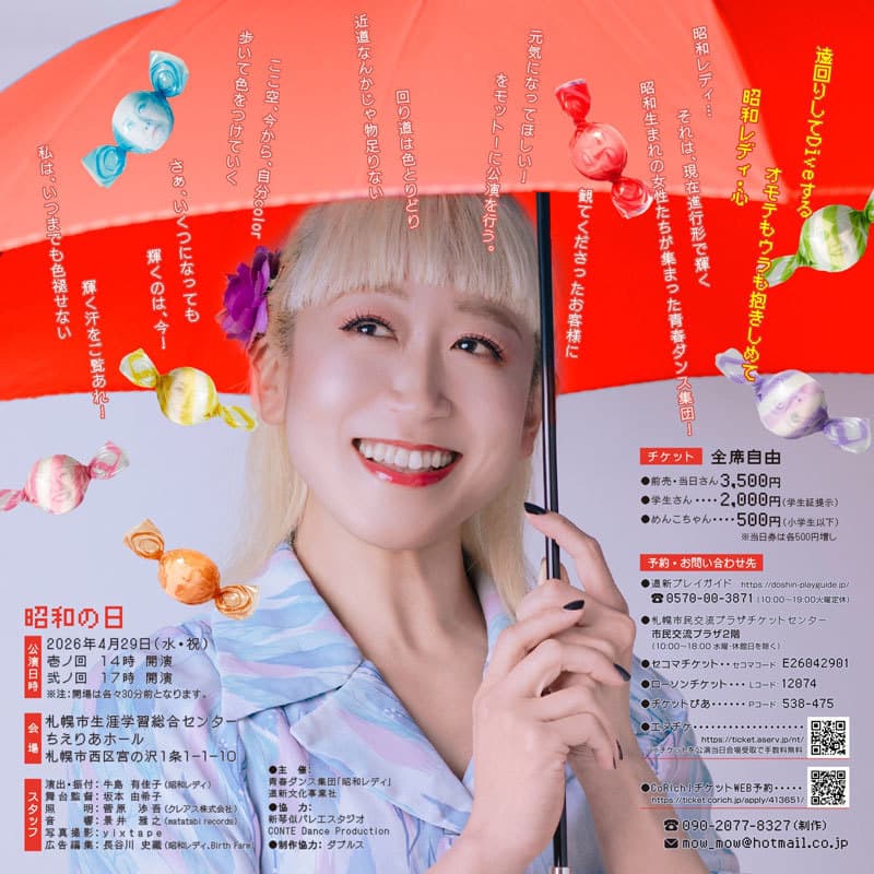| 昭和レディ… それは、現在進行形で輝く昭和生まれの女性たちが集まった青春ダンス集団! 観てくださったお客様に元気になってほしい!をモットーに公演を行う。 最近はAIなどが現れ、効率的に最短の道で…という考えが増えてきていると思います。それももちろん大切なのですが、遠回りしてこそ得られる宝物のようなものがあります。昔は今のように情報がたくさんなかったので、みんなが時間をかけて物事を成し遂げてきました。その経験の大切さ、そしてそこには人間らしさというものがあるかと思います。便利になってきた反面、AIと人間の違い、人間にしかできないものは何なのかがこれからもっと大切になってきます。それを作品を通してご覧いただけたらと思っております。 …と真面目な感じは置いといて、たくさんの方に笑っていただき、前を向いていただけたらと思い創作しております! 是非ご期待ください。 各種プレイガイドチケット販売は1/5月10:00〜です! メンバーにでしたら今からでもご予約お受けできます笑 また今年の昭和の日に皆様にお会いできることを楽しみにしております!! 遠回りしてDiveする オモテもウラも抱きしめて 昭和レディ・心 昭和レディ… それは、現在進行形で輝く昭和生まれの女性たちが集まった青春ダンス集団! 観てくださったお客様に元気になってほしい!をモットーに公演を行う。 回り道は色とりどり 近道なんかじゃ物足りない ここ空、今から、自分color 歩いて色をつけていく さぁ、いくつになっても輝くのは、今!! 輝く汗をご覧あれ! 私は、いつまでも色褪せない ●公演日時 昭和の日(2026年4月29日(水・祝) ) ・壱ノ回 14時 開演 ・弐ノ回 17時 開演 注:開場は各々30分前となります。 ●会場 札幌市生涯学習総合センターちえりあホール 札幌市西区宮の沢一条1-1-10 ●出演 カイハラアキコ、かなえさん、菅野のぞみ、小鹿道子、佐々木理恵、高瀬育子、長谷川史織、牛島有佳子 他 ●スタッフ 演出・振付 : 牛島有佳子(昭和レディ) 舞台監督 : 坂本 由希子 照明 : 菅原 渉吾(クレアス株式会社) 音響 : 景井 雅之(matatabi records) 写真撮影:yixtape 広告編集:長谷川 史織(昭和レディ、Birth Farm) ●料金 全席自由 ・前売さん 3,500円 ・学生さん 2,000円(学生証提示) ・めんこちゃん 500円(小学生以下) ※当日券は各500円増し ●主催 青春ダンス集団「昭和レディ」 道新文化事業社 ●後援 北海道 北海道教育委員会 札幌市 札幌市教育委員会 HTB北海道テレビ TVhテレビ北海道 STV札幌テレビ放送 UHB北海道文化放送 ●協力 新琴似バレエスタジオ CONTE Dance Production ●制作 協力ダブルス ●予約 ・道新プレイガイド TEL 0570-00-3871 (10:00~19:00火曜定休) https://doshin-playguide.jp/ ・札幌市民交流プラザチケットセンター市民交流プラザ2階(10:00~18:00水曜・休館日を除く) ・セコマチケット(セコマコード:E26042901) ・エヌチケ(https://ticket.aserv.jp/nt/) チケットを公演当日会場受取で手数料無料 ・ローソンチケット(Lコード:12074) ・チケットぴあ(Pコード:538-475) ・CoRich!チケット WEB予約https://ticket.corich.jp/apply/413651/ ・電話 090-2077-8327(制作) ・Eメール mow_mow@hotmail.co.jp |